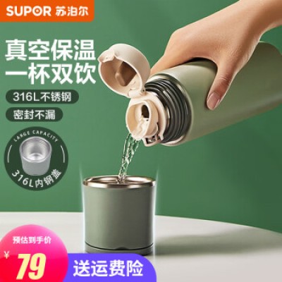SUPOR insulated cup, 316 stainless steel large capacity water cup, student insulated cup, men's and women's car mounted outdoor portable cup, 500ML ink green