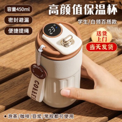 Hualang Insulated Cup Water Cup High Appearance Student Coffee Cup Portable 316 Stainless Steel Insulated Accompanying Cup [Intelligent Temperature Display] Brown Cap 450ml